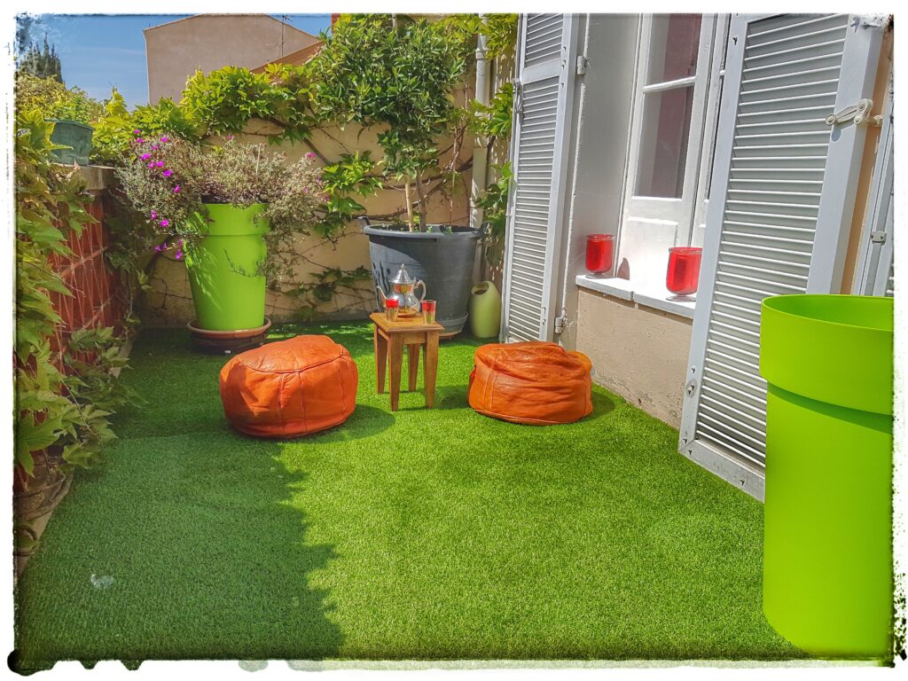 Décoration soignée, grande terrasse de 15 m2 plein sud avec mobilier de jardin, transat et parasol, barbecue. Chambre climatisée avec lit en 160×200.
