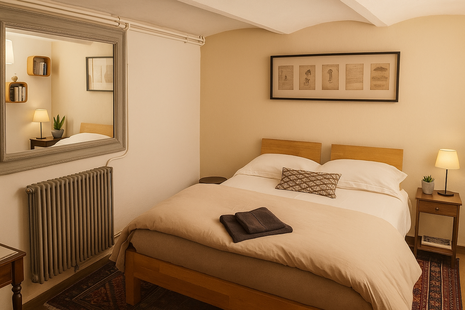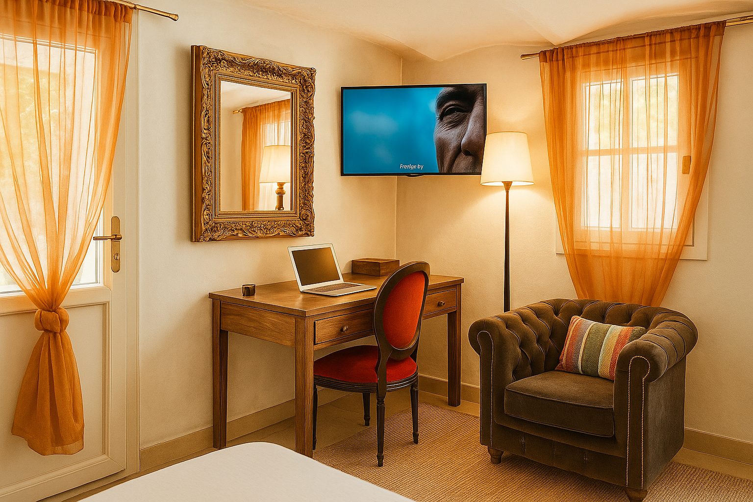 Chambre de 12 m² meublé et décorée avec soin, lit en 160×200, bureau, fauteuil, Télévision LCD 82 cm, Internet, Chauffage central.